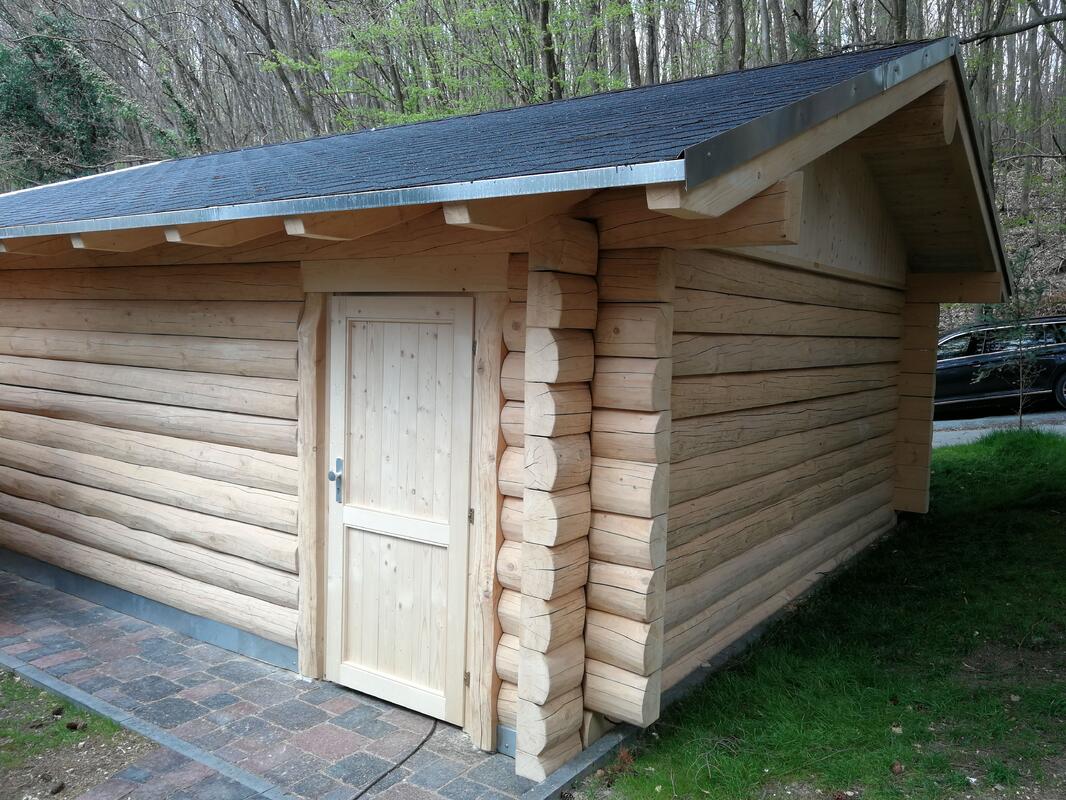 Ebenfalls von uns realisiert... das Halbstammblockhaus mit 5x6m Achsmaß zur Nutzung als Garage (Garagentor voll elektrisch von Hörmann - versteht sich)