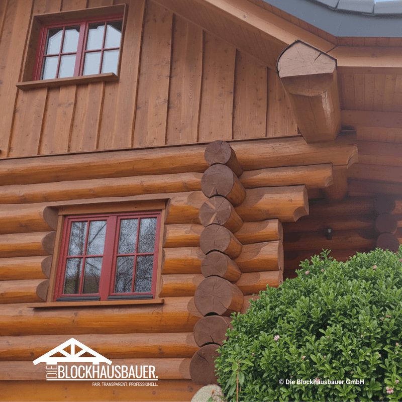 Das besondere am Blockhaus "Bear Creek Lodge" sind der geblockte Windfang nebst Schleppdach sowie die Gauben im Obergeschoss. Außerdem hat das Blockhaus außenliegende Fußpfetten. Gerade der mit dem Schleppdach überdachte Eingangsbereich und der Windfang machen den Reiz aus.