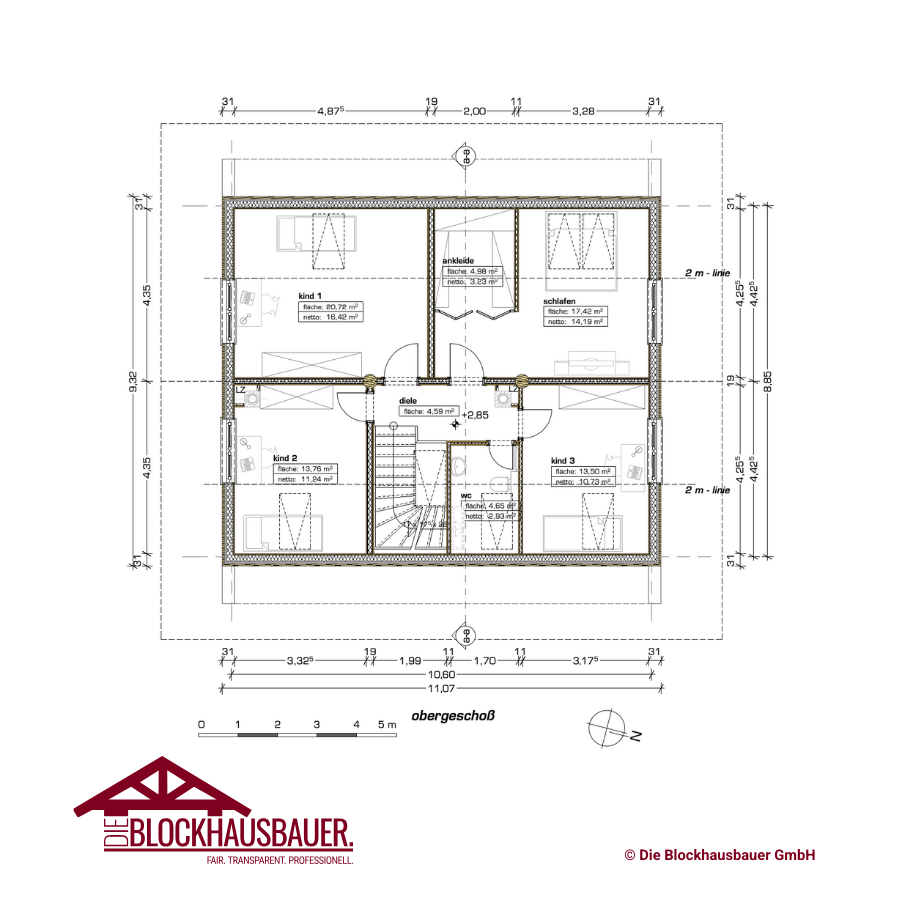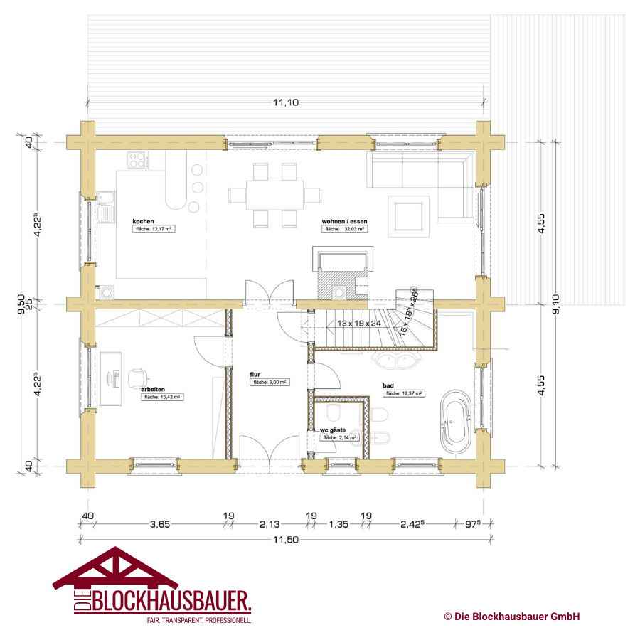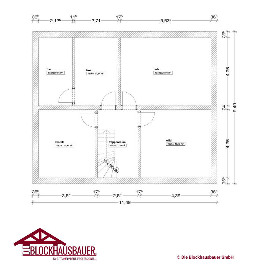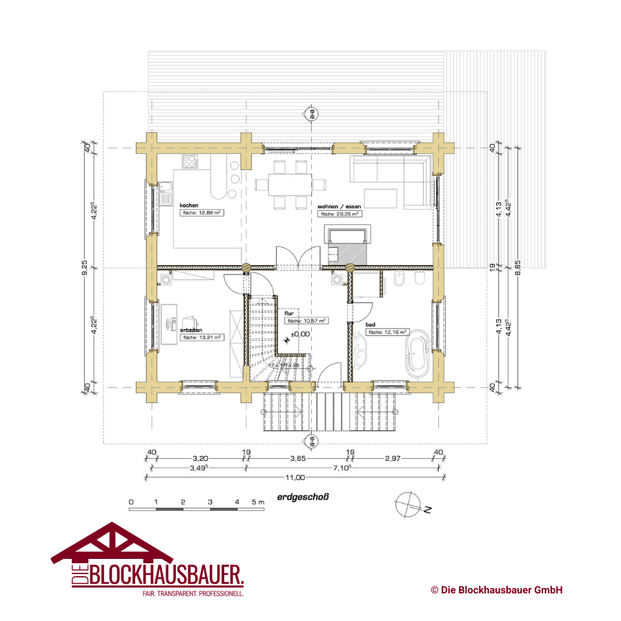 - Grundfläche: 11m x 9,25m (andere Achsmaße jederzeit möglich)