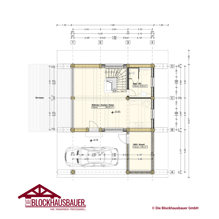 Unser Post & Beam Blockhaus "Little Eagle II" bietet mit einer Grundfläche von 7,80m x 6,30m (49qm) und einer Wohnfläche von rund 77qm (brutto) viel Platz und Komfort.