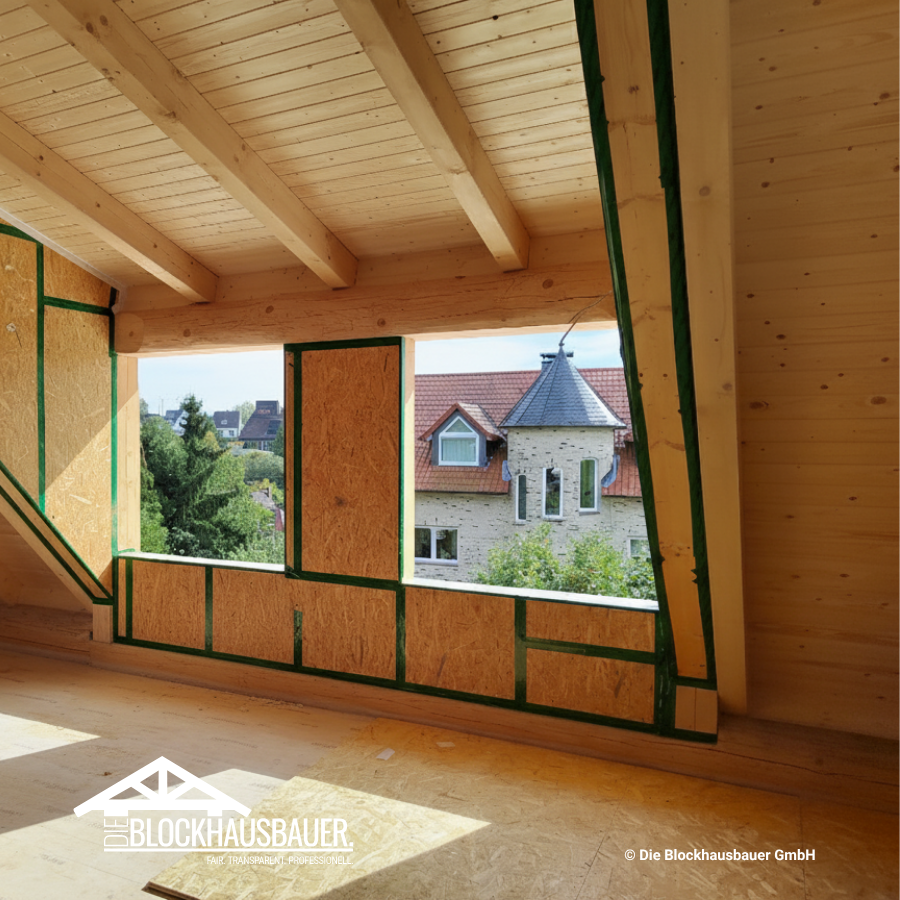 - Dämmung der Längskanäle der Blockwände mit Dichtband & Schafwolle von ISOLENA