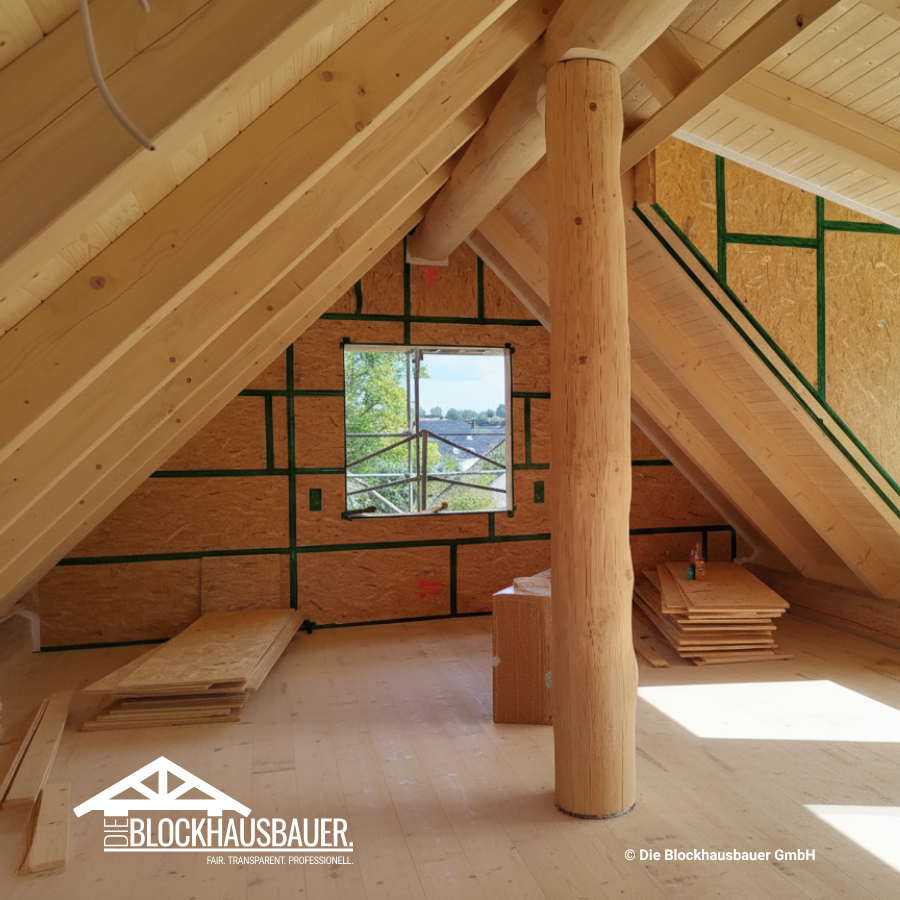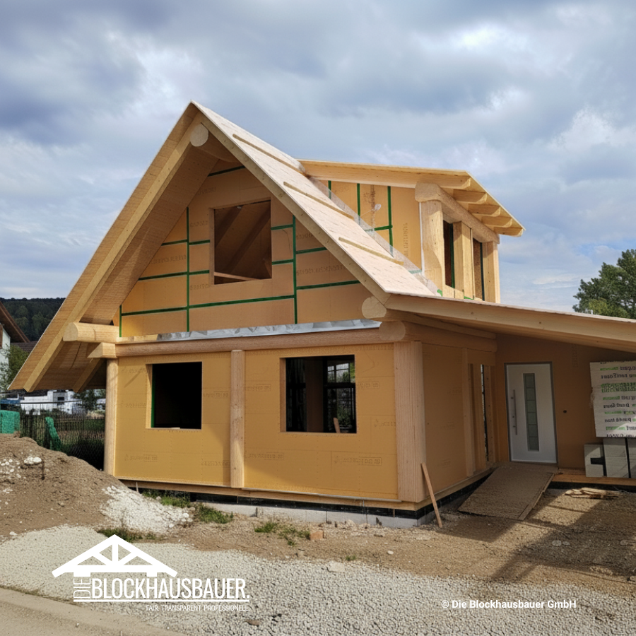 - Montage der Blockhausbauteile, der Sparren und der Holztafelwände (Außen- und Innenwände im EG und OG) auf bauseits durch Auftraggeber fertig vorbereiteter Bodenplatte**