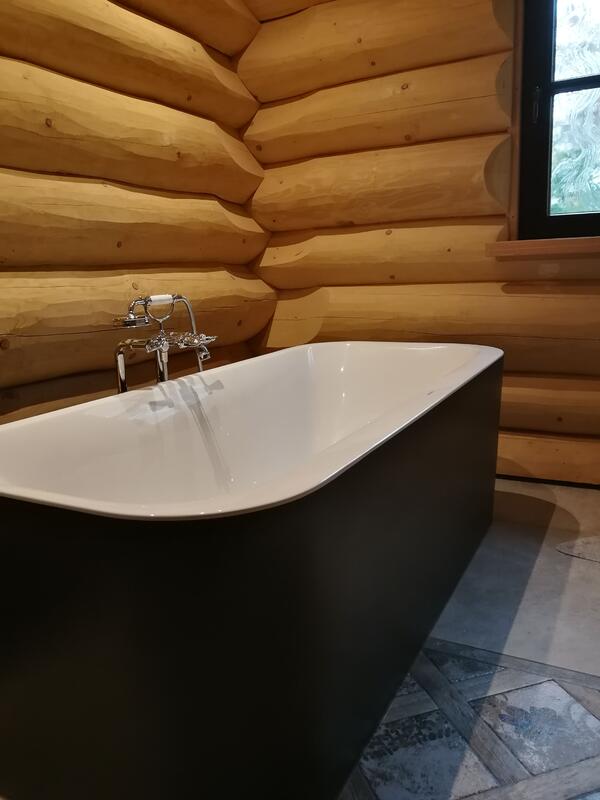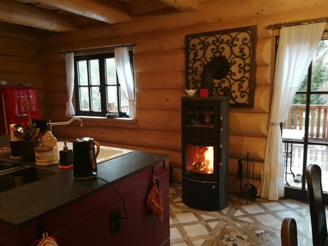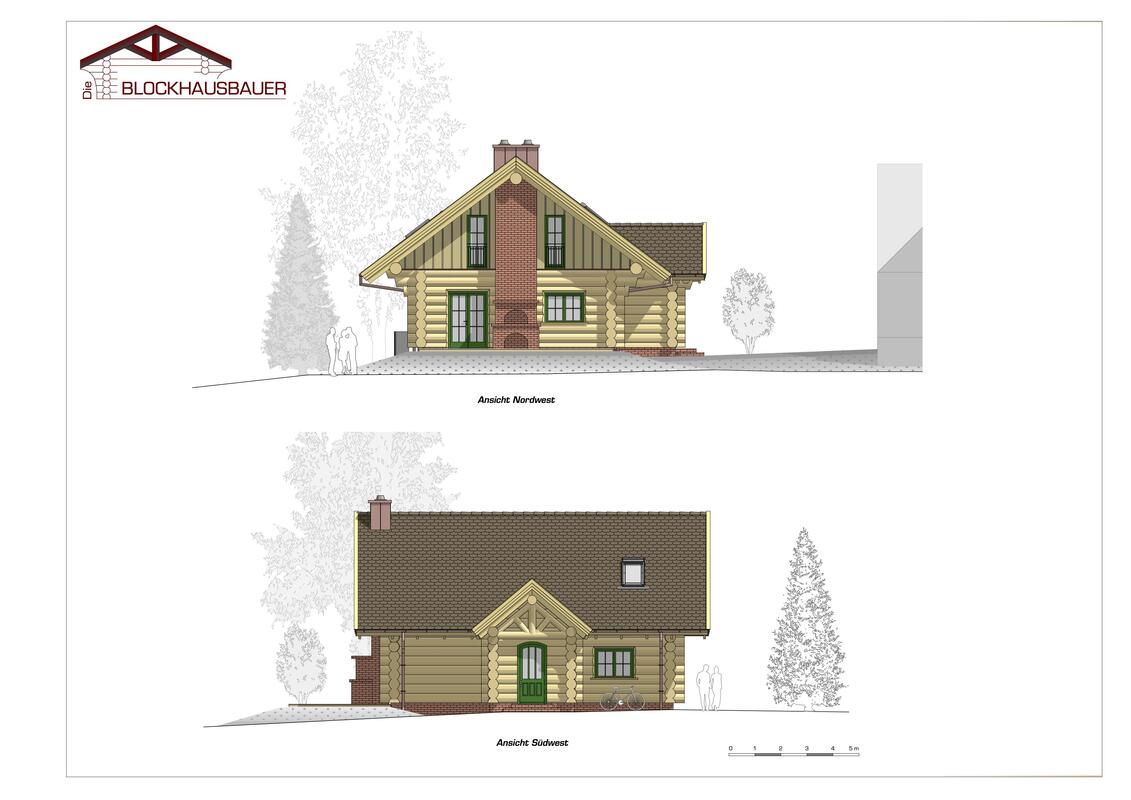 Der Windfang - ebenfalls in Rundstamm - kann optional gebucht werden. Die große Terrasse und der 2-zügige Schornstein für einen Innen- und einen Außenkamin machen die besonderen Highlights unserem kanadischen Blockhaus "Tucker" aus.