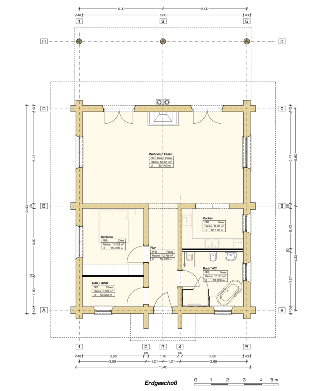Bei Bedarf kann man über den Räumen HWR / Schlafen / Flur / Bad / Küche eine weitere, bewohnbare Etage schaffen. Das Blockhaus hätte dann 1,5 Etagen und nochmals gut 52qm weitere Wohnfläche. Die Dachneigung müsste dazu angehoben werden.