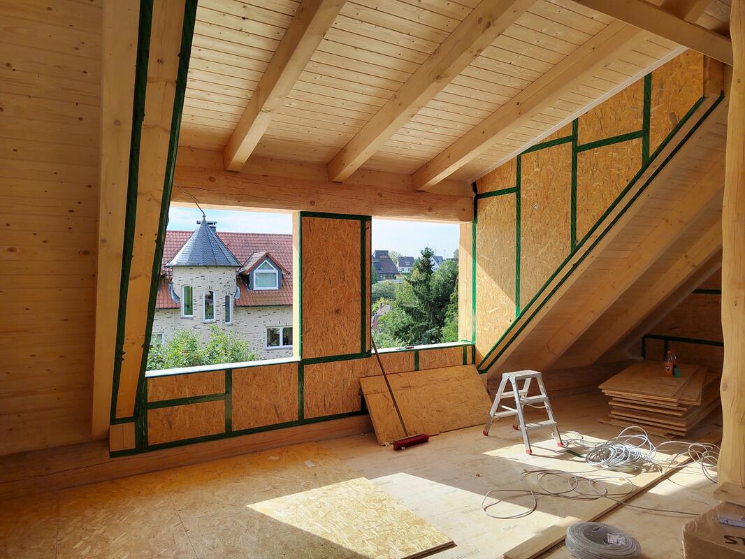 - Innenseitige Verkleidung der Holztafelwände mittels 15mm OSB/3
