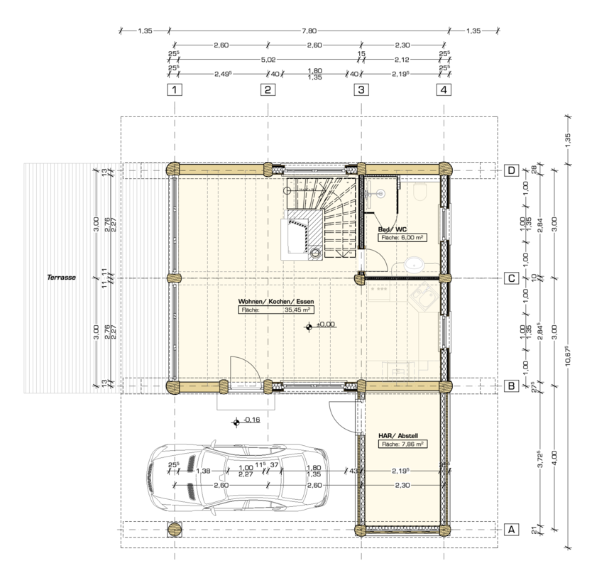 Unser Post & Beam Blockhaus "Little Eagle II" bietet mit einer Grundfläche von 7,80m x 6,30m (49qm) und einer Wohnfläche von rund 77qm (brutto) viel Platz und Komfort.