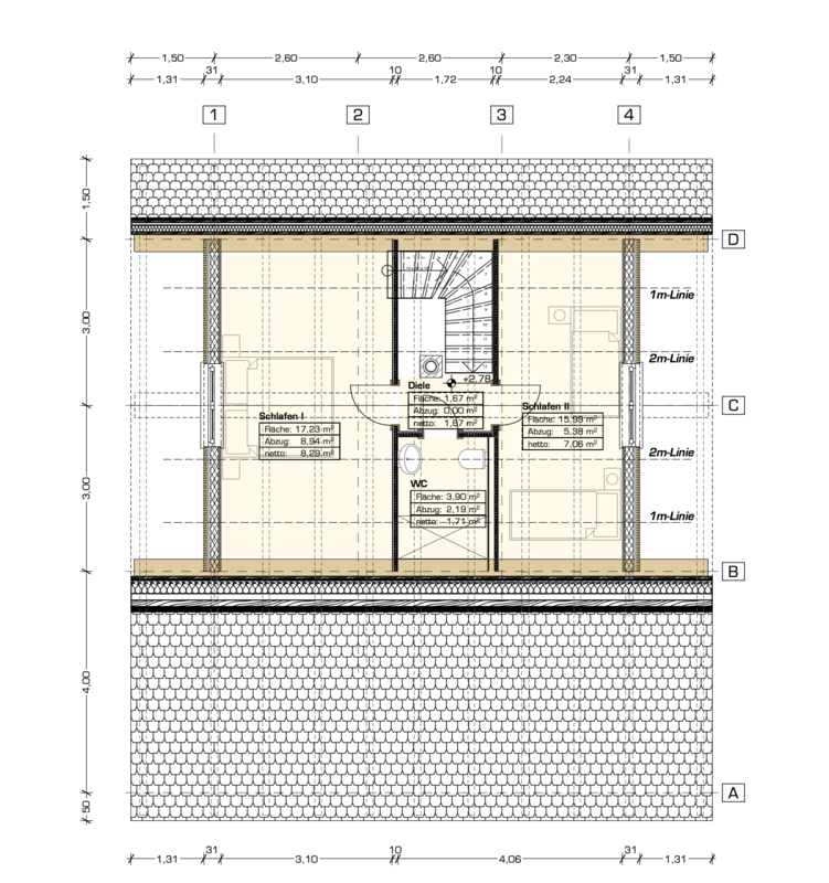 Die Wandstärke der Holztafelwände beträgt rund 268mm, davon sind 240mm gedämmt. Die Blockwände im Grundriss sind optional und können durch Holztafelwände ersetzt werden. Zudem sind im Obergeschoss eine oder sogar zwei Gauben möglich.
