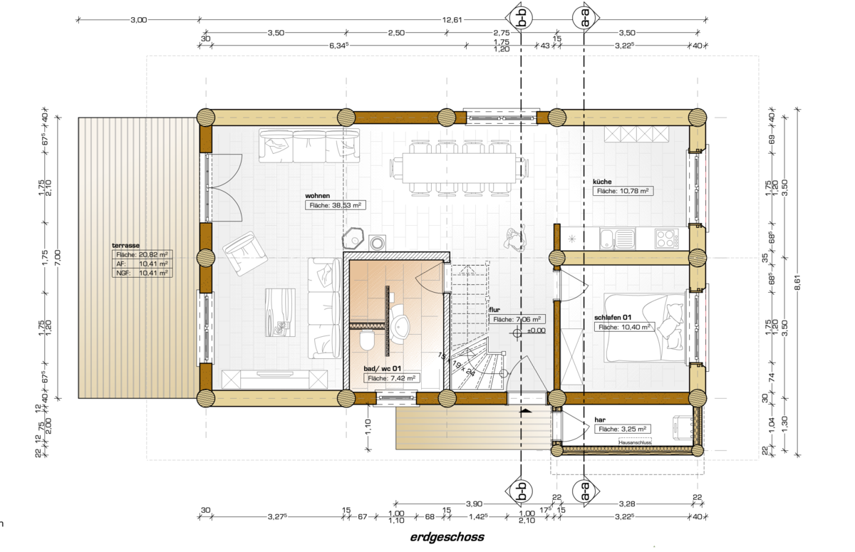- Schwellholz als Brettschichtholz in Fichte (kann auch in Stein im Zuge Tiefbau / Herstellung Bodenplatte ausgeführt werden)