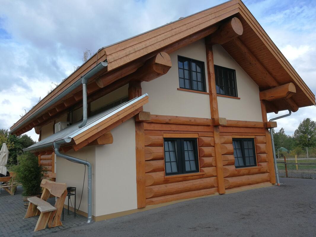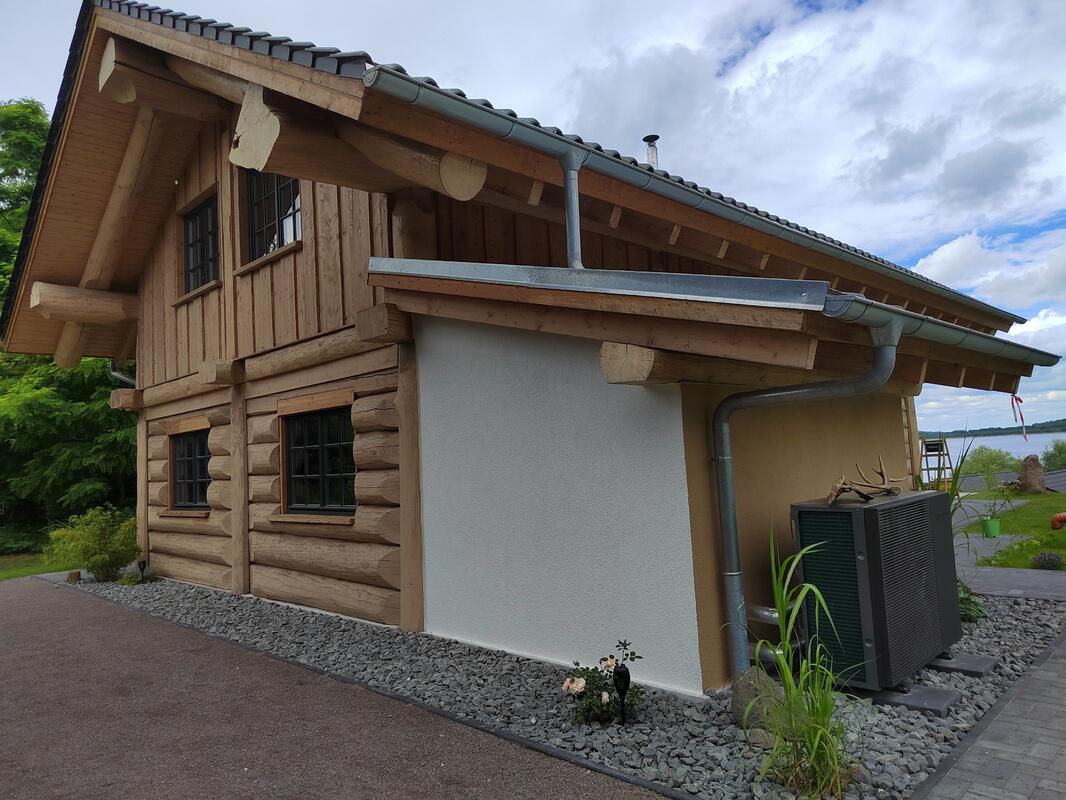 Auch die äußere Optik des Blockhaus kann sehr stark individualisiert werden. Die Wahl des Farbton für das Öl des Holzanstrich ebenso wie der Farbton der Putzflächen kann ganz nach Geschmack des Bauherrn festgelegt werden. Ebenso ob die Giebel und Kniestock mittels Holzverkleidung geschlossen werden oder auch mit einer Putzträgerplatte (WDVS).