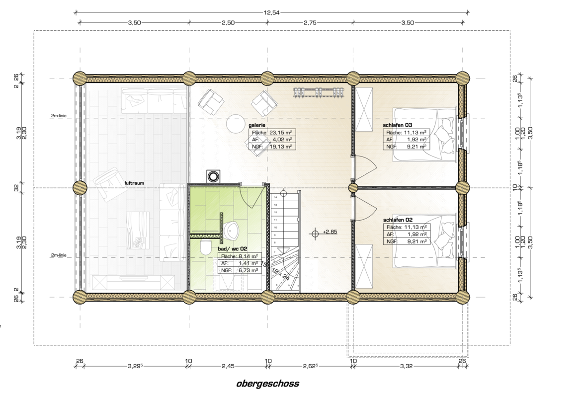 Im Obergeschoss gibt es zwei weitere Schlafräume, ein zweites Bad und eine Galerie. Der Luftraum kann aber auch vollständig geschlossen werden (vollständige Zwischendecke). Dann können anstelle des Luftraum dort noch bis zu 2 weitere Zimmer entstehen.