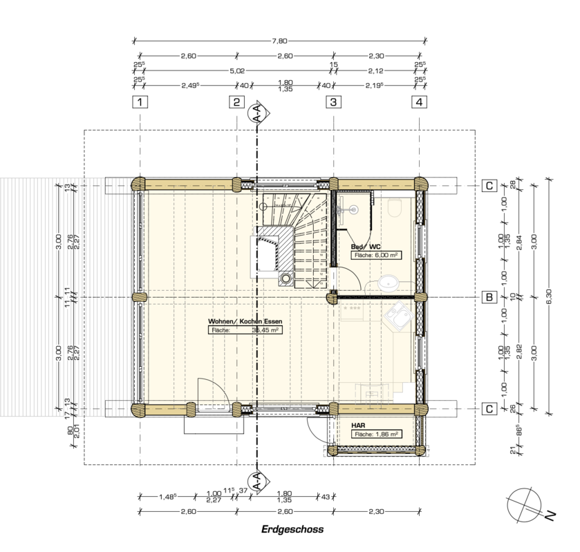 Im Post & Beam Blockhaus "Little Eagle I" steckt mit einer Grundfläche von gerade einmal 49qm (7,80x6,30m) mehr Platz und Wohnlichkeit als man zunächst vermuten mag. Ein großzügiges, lichtdurchflutetes Erdgeschoss mit einem tollen Kamin und einem Bad mit großer Regendusche sowie einer großzügigen Küche lässt keine Wünsche offen. Die Wohnfläche im EG beträgt entsprechend 42,45qm. Hinzu kommt ein Hauswirtschaftsraum mit rund 2qm. Dieser kann bei Bedarf aber auch größer gebaut werden.