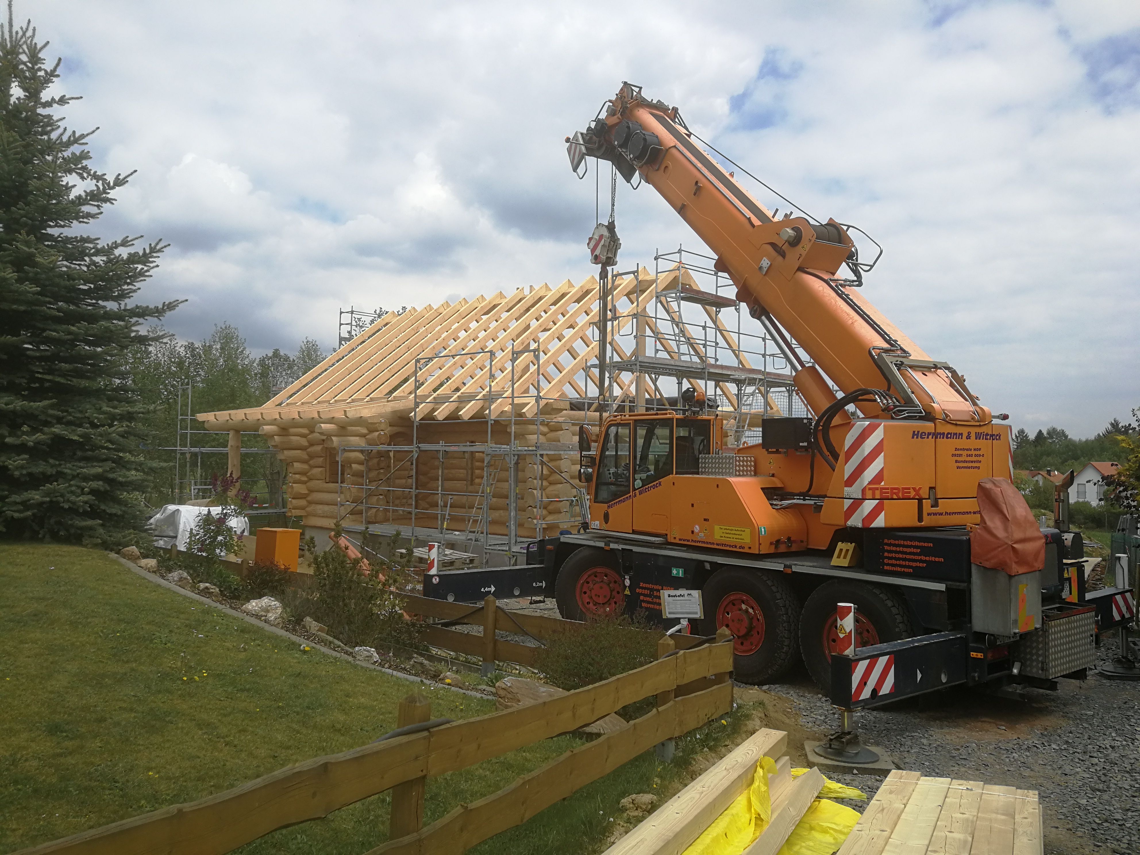 Die Montage erfolgt auf der fertigen Bodenplatte. Ein Kran ist - ausgenommen Blockhaussauna "Little Fox" - zwingend notwendig um die schweren Stämme sicher zu heben. Abhängig von der Größe des Projektes und damit der Dauer der Montage entscheiden wir zwischen einem Minikran, Autokran oder Turmdrehkran.