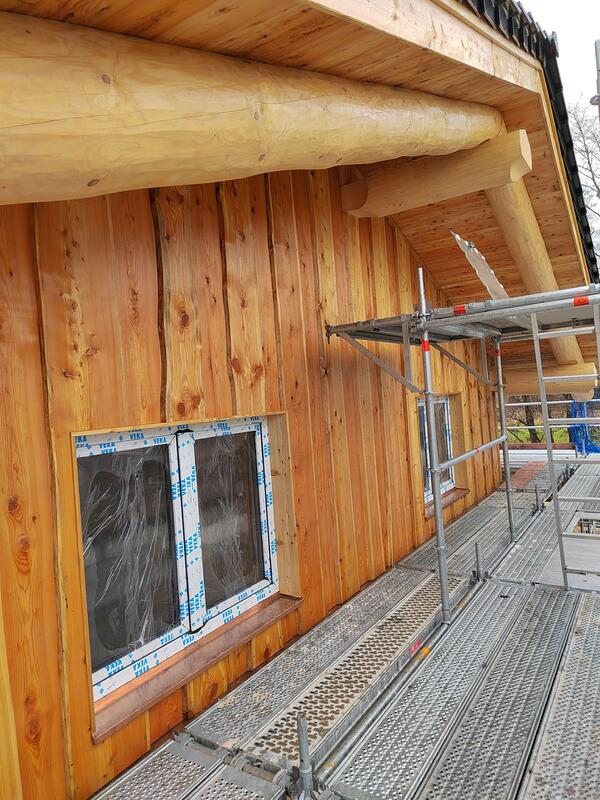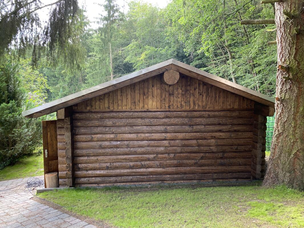 Dieses Blockhaus wurde 2x mit Naturöl und 1x mit Edelwachs mit UV-Blocker im Farbton Pinie gestrichen