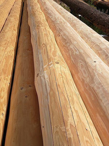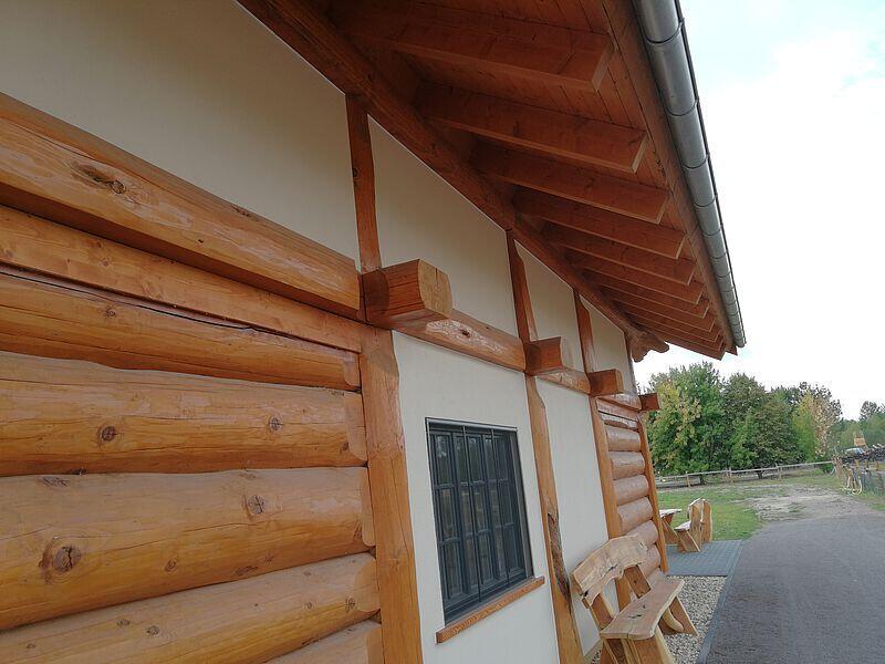Um ein Naturstammhaus / Blockhaus optimal vor den Witterungseinflüssen zu schützen, ist ein großer Dachüberstand zunächst einmal ein Muss. Der Dachüberstand an den Giebelseiten sollte 1,50m bis 2,0m betragen. Der Dachüberstand an den Traufseiten 1,50m bis 1,80m. Dies ist natürlich auch immer abhängig vom gewählten Grundriss des Blockhauses. Man spricht von dem sogenannten "konstruktiven Holzschutz", sprich die Konstruktion des Naturstammhauses selbst schützt bereits das Holz. Ist auf diese Weise ausreichend Schutz vor Regen und Sonneneinstrahlung (UV-Strahlung) gewährleistet, muss man ein Naturstammhaus theoretisch nicht streichen.