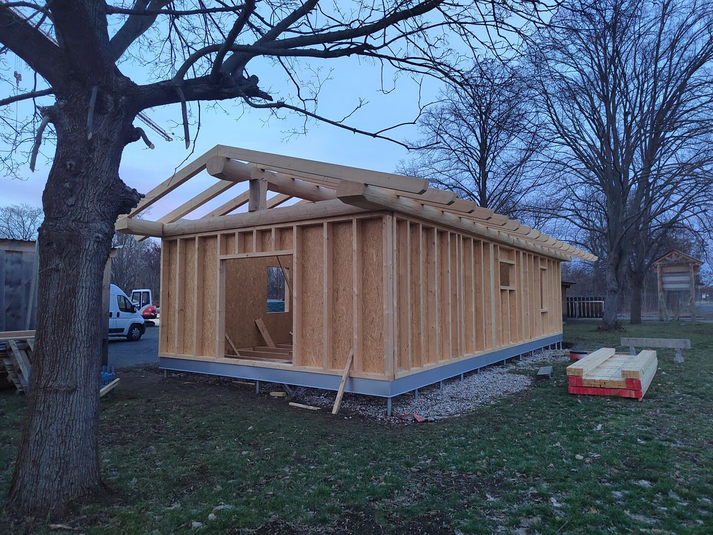 Die Herstellung eines Hauses in Holzständerbauweise, auch als klassischer Holzrahmenbau bekannt, ist eine der ältesten und bewährtesten Formen des Holzhausbaus. Typischerweise werden die Wände eines Hauses aus Riegeln und Stehern gefertigt – meist aus hochwertigem Konstruktionsvollholz (KvH) oder LVL-Holz.