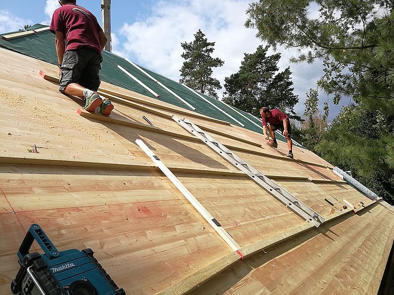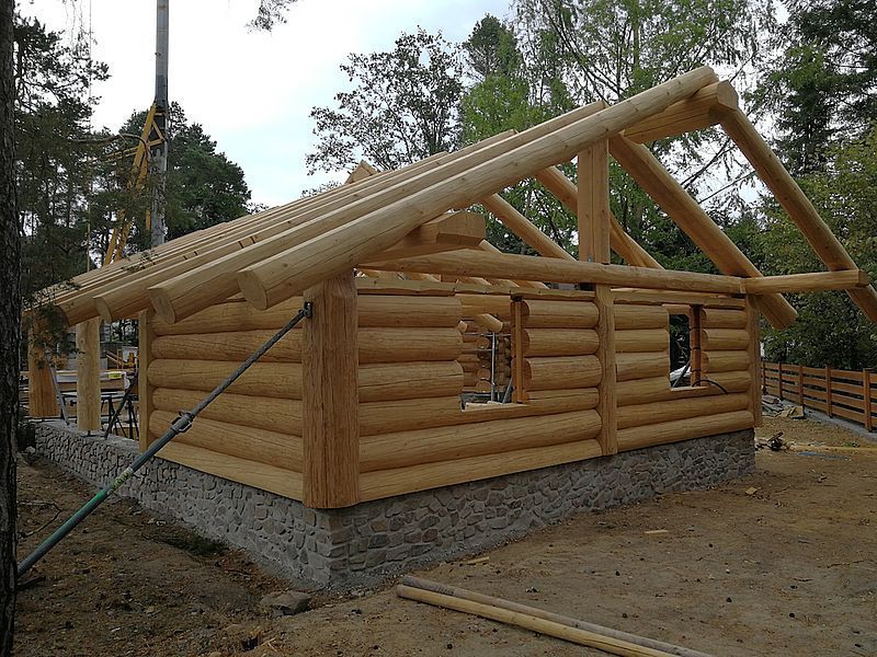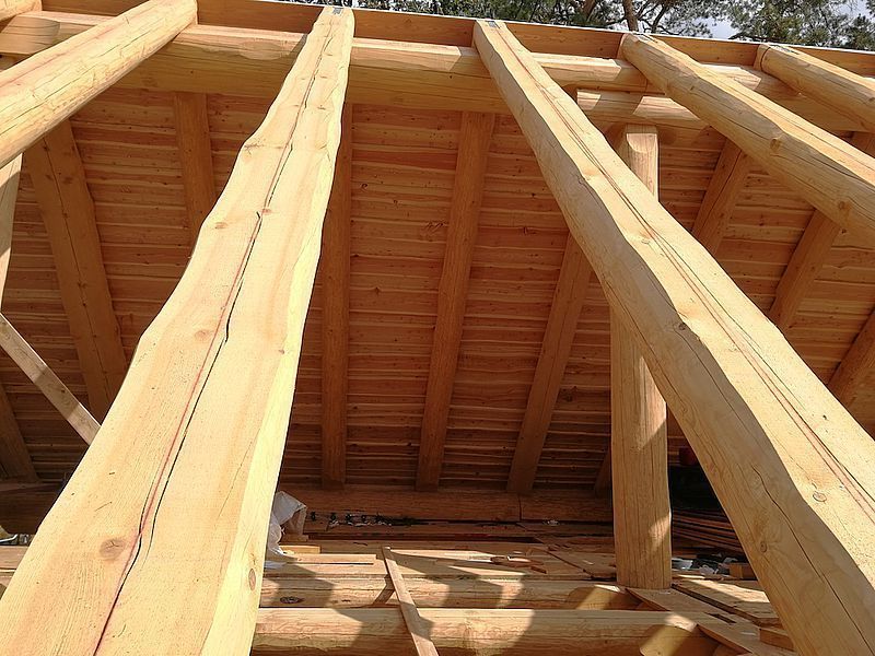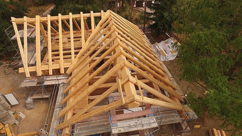 Der Dachstuhl (Sparren) in Naturstammbauweise / Rundstamm ist montiert und das Dach wird mittels einer Boden-Deckel-Schalung in Lärche geschlossen. Ebenfalls montiert ist das Naturstammhaus - Carport in Post&Beam - Bauweise, auch hier mit Sparren in Rundstamm.
