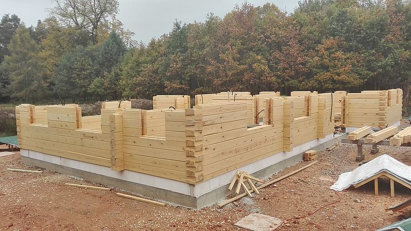 ... entsteht gerade durch uns in der Dübener Heide. Ein Naturstammhaus, allseits besäumt im "Alpen-Stil". Die Eckverbindungen als Tiroler Schloss ausgearbeitet. In dem Blockhaus werden am Ende mehr als 3.000m Baumstämme (Holz) verbaut sein. Wir verwenden einheimische Kiefer, ein Novum.