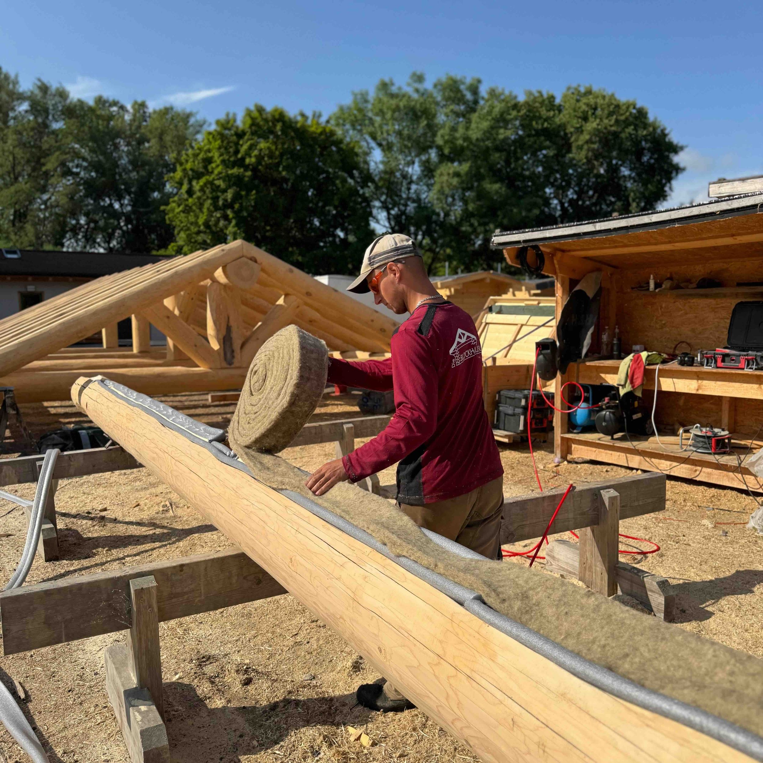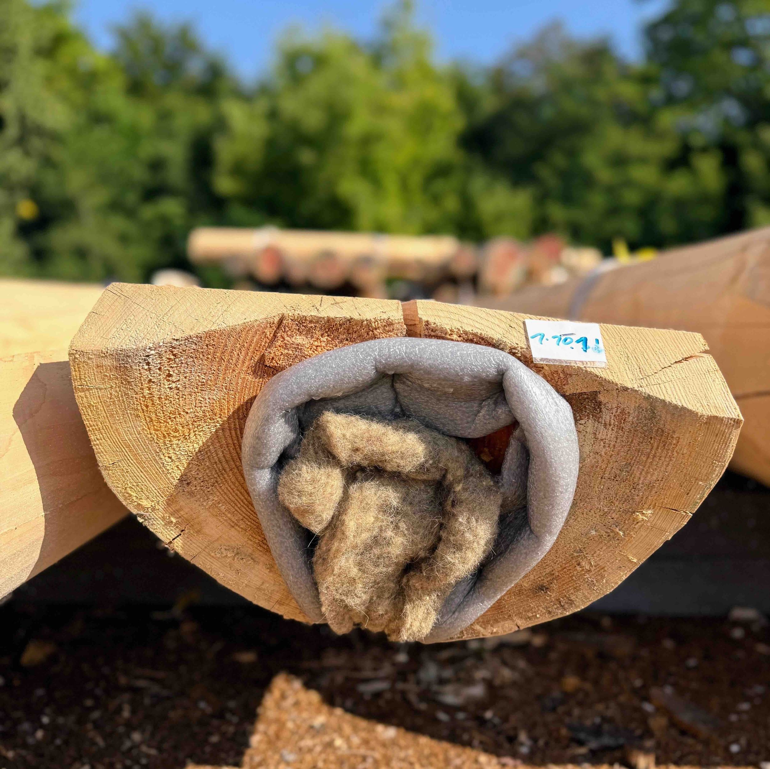 Zusätzlich zum mechanischen Dichtband betten wir in die Längskanäle reine Schafwolle ein. Dies dient nicht nur der reinen Wärmedämmung, sondern auch der Unterbindung von Konvektionsströmungen. Sollte theoretisch Wind durch kleinste natürliche Trocknungsrisse im Stamm eindringen, verhindert die Wolle die Entstehung eines Luftkanals innerhalb der Wand.