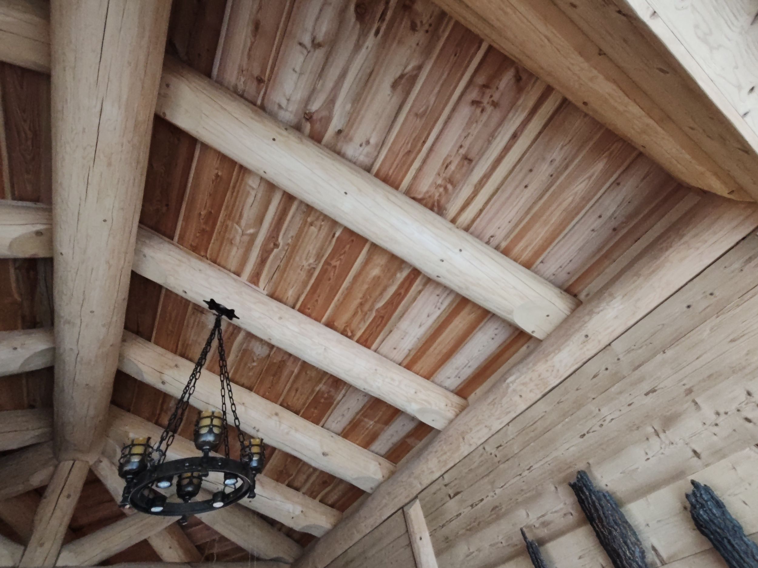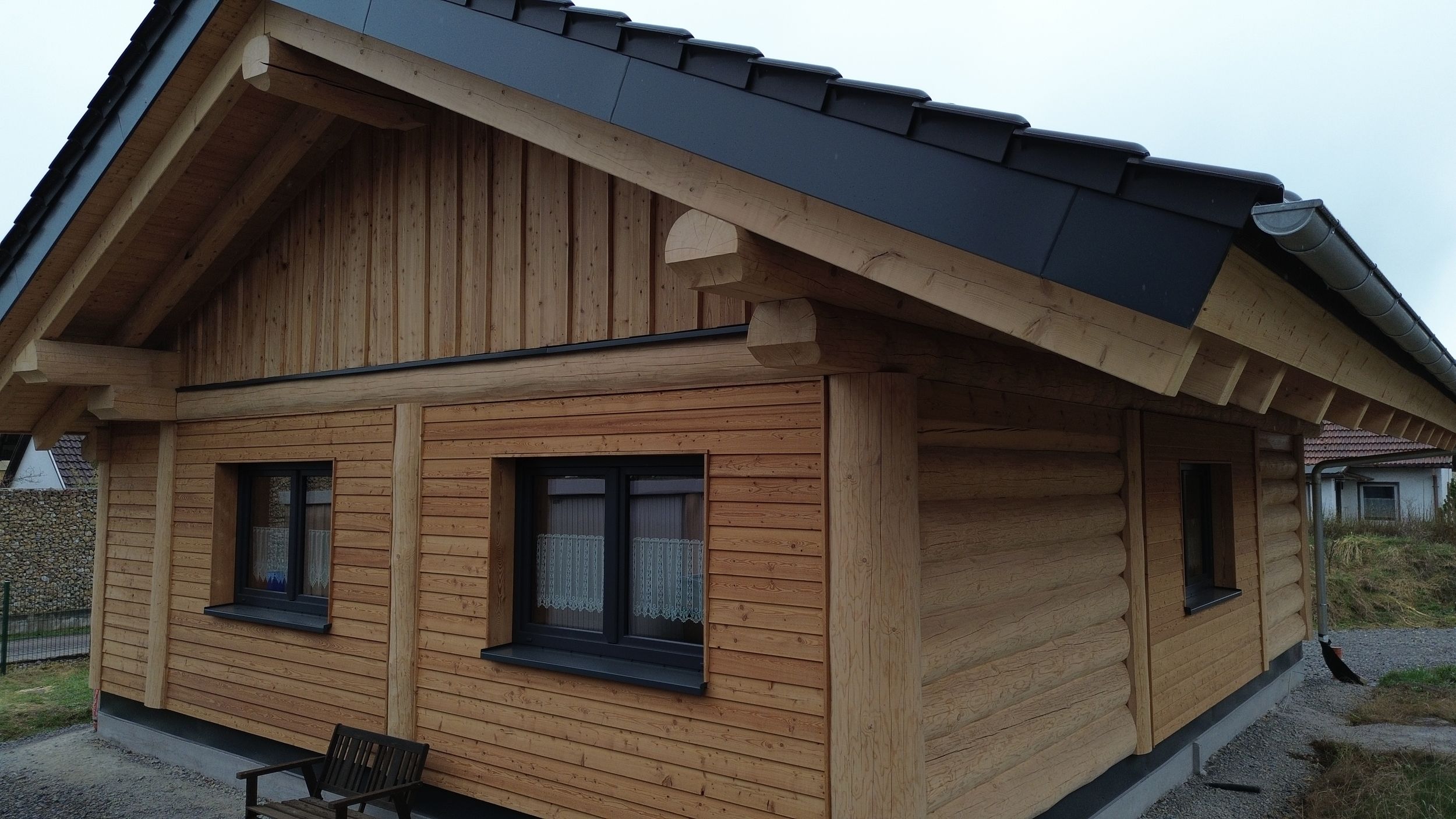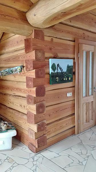 Im Blockhausbau nutzen wir die Lärche besonders gern für besäumte Wände (ein- oder beidseitig flach geschnitten). Der Grund dafür ist die spektakuläre Optik: